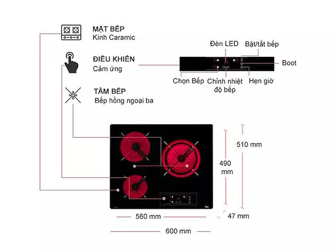 | Kiểu dáng | 03 vùng nấu điện (hồng ngoại) |