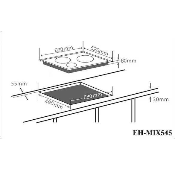 - Mâm từ đường kính 16/22cm hỗ trợ tính năng nấu nướng, Kích thước bề mặt bếp từ Chefs EH-MIX545N: 600 x 520 x 60 mm khiến người dùng có thể lựa chọn nhiều nối nấu khác nhau.