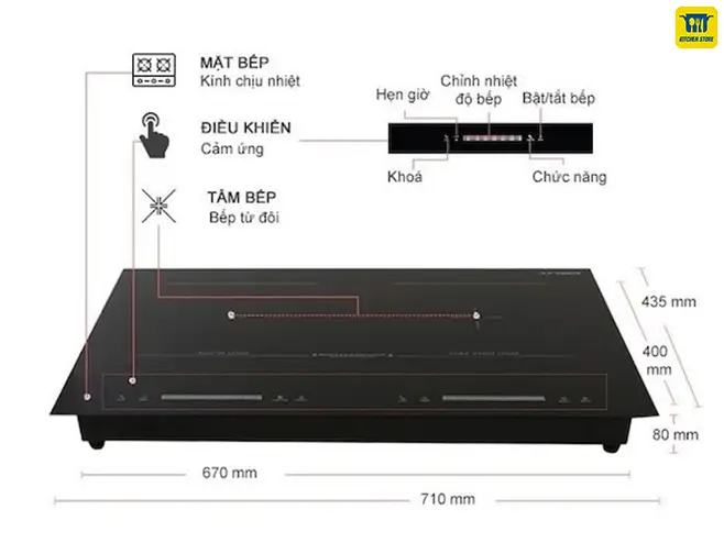 Bếp sử dụng mặt kính cao cấp sáng bóng cùng với thiết kế các phím điều chỉnh công suất bằng các dải vạch từ nhỏ đến lớn, bên cạnh là các phim on/off, chức năng khác thiết kế riêng ở phía mỗi vùng bếp.