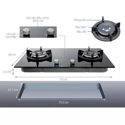 | Mặt bếp | Mặt kính cường lực, chịu nhiệt dày 8mm |