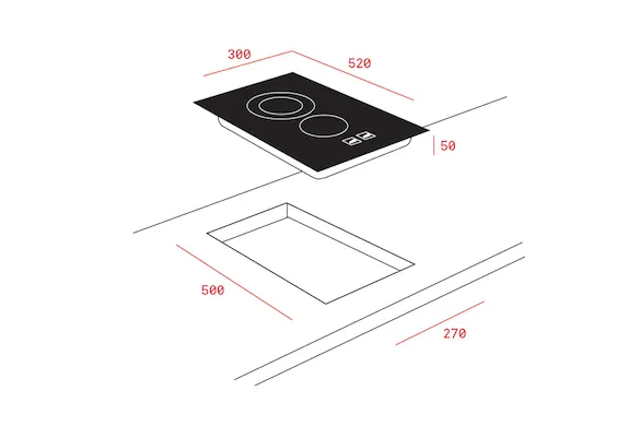 02 mặt bếp nấu: 1 bếp có vùng nấu Ø 120/180 mm, một bếp nấu có vùng nấu Ø 145mm