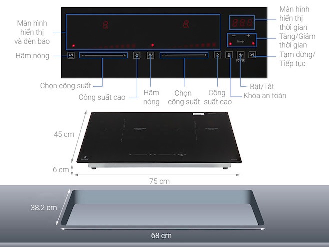 - Tính năng an toàn: cảnh báo mặt bếp nóng, khóa bảng điều khiển,…