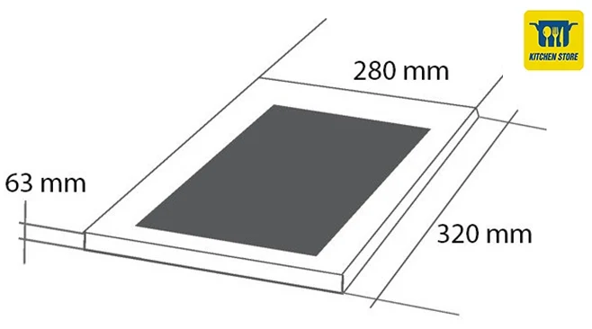- Kích thước: chiều dài 320mm, chiều rộng 280mm, chiều cao 63mm