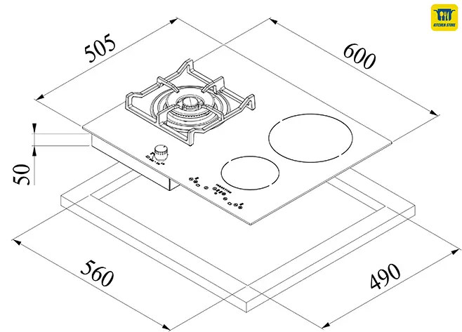 Kích thước mặt bếp: 600 x 505mm.