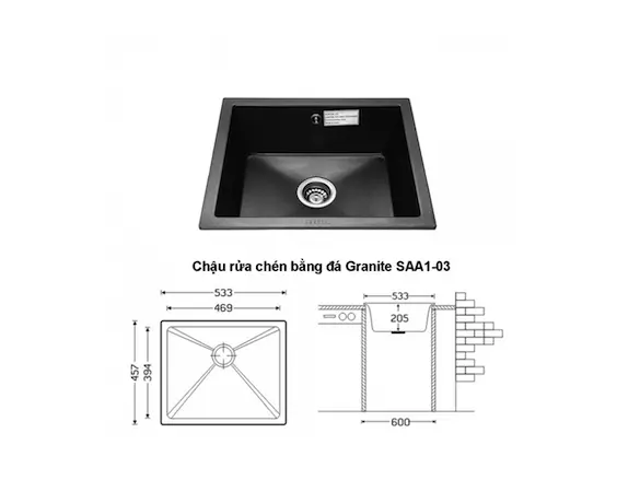 Hình ảnh kỹ thuật chi tiết của sản phẩm chậu đá granite 1 hố nhỏ SAA1