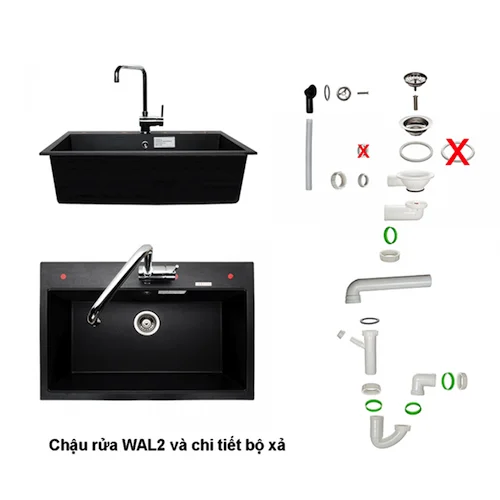 Chậu rửa chén bằng đá Granite WAL2 của Carysil đã bao gồm đầy đủ bộ xả (xiphong) phía dưới. Khách hàng sẽ không phải lo lắng mua thêm bộ xả khi mua mới chậu.