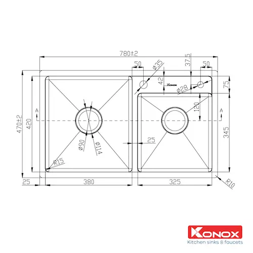 Với bề ngang chậu 780mm, chậu thích hợp với những bàn bếp hẹp ngang.