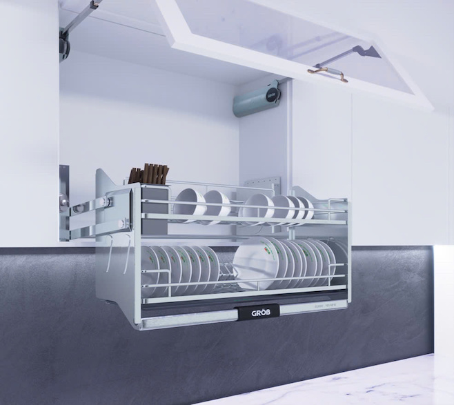 Tối ưu không gian bếp trên cao: Giúp tận dụng không gian trong tủ bếp trên, tiết kiệm diện tích và giữ bát đĩa luôn gọn gàng, ngăn nắp.
