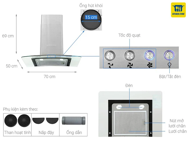 - Chất liệu lưới lọc: Inox cao cấp, than hoạt tính