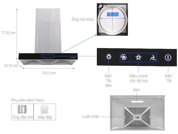 Máy hút mùi Junger HRJ-75 được trang bị 3 tốc độ gió hoàn toàn bằng cảm ứng, tiện lợi, dễ dàng sử dụng, phù hợp với nhiều hình thức chế biến thức ăn khác nhau. Ngoài ra, sản phẩm còn được trang bị hệ thống đèn chiếu sáng với hiệu suất cực cao nhưng mức tiêu thụ điện thấp gấp 5 lần so với những loại đèn chiếu thông thường, hỗ trợ hiệu quả cho người dùng trong quá trình nấu ăn.
