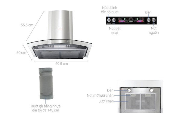 Lưới lọc dày ngăn dầu mỡ, mắm muối bắn vào motor và các linh kiện khác gây hỏng hóc, giảm tuổi thọ sản phẩm. Thiết kế dễ dàng tháo rời giúp bạn tiện vệ sinh lưới lọc thường xuyên. Bên cạnh đó là 2 đèn LED có khả năng chiếu sáng tốt giúp cung cấp đủ ánh sáng cho người nội trợ nấu nướng ngon hơn.