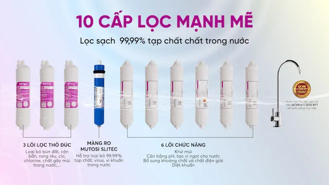 10 cấp lọc mạnh mẽ – Lọc sạch 99,99% tạp chất trong nước