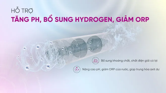 - Lõi ORP Hydrogen: Bổ sung các vi khoáng có lợi, làm tăng độ pH, giảm ORP của nước, hỗ trợ trung hòa axit dư, chống oxy hóa, tăng cường sức đề kháng cho cơ thể
