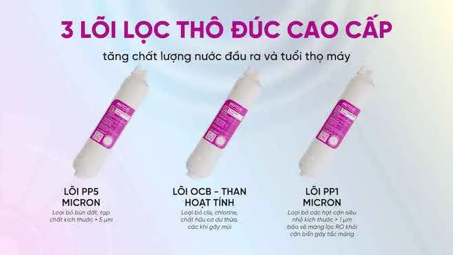 - 3 lõi lọc thô: không chỉ giúp loại bỏ rong rêu, bùn đất, rỉ sét, cát…có kích thước nhỏ đến 1 micron và các chất gây hữu cơ mà còn góp phần bảo vệ màng lọc RO khỏi cặn bẩn gây bít tắc màng