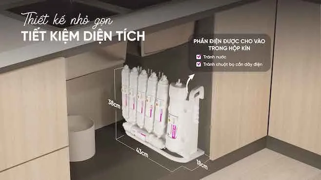 - Hệ thống 10 lõi lọc bổ sung khoáng chất, trong đó lõi hydrogen hỗ trợ tăng cường miễn dịch và ngăn ngừa lão hóa hiệu quả (trong khi các dòng máy để gầm khác thường chỉ có 7-8 lõi lọc, thiếu lõi chức năng bổ sung khoáng và không có lõi hydrogen)